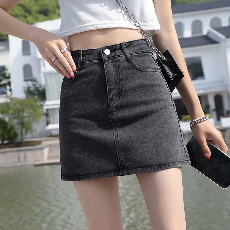 Rok Denim wanita Hong Kong, rok a-line lurus serbaguna musim panas hitam abu-abu pelangsing gaya kuliah baru