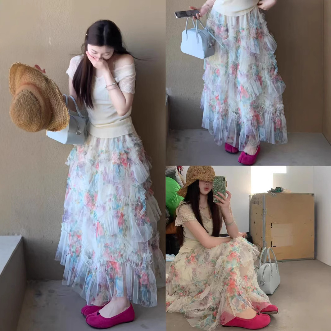 Rok setengah panjang sifon Jepang tunggal a-line anti-transparan 2023 baru floral Musim Semi dan musim gugur rok kasa wanita rok payung pelangsing