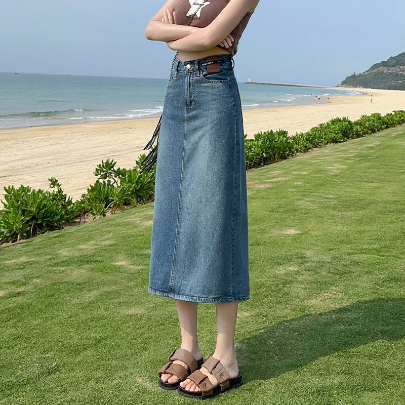 Rok denim wanita pinggang tinggi, Rok midi ketat a-line retro, rok niche trendi model tahun, rok denim terpisah, pinggang tinggi, musim panas