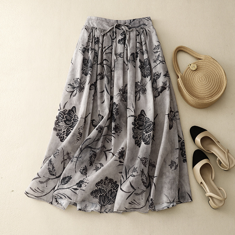 Real shot 2024 musim panas baru artistik retro longgar cetak rok ayun untuk wanita #6617