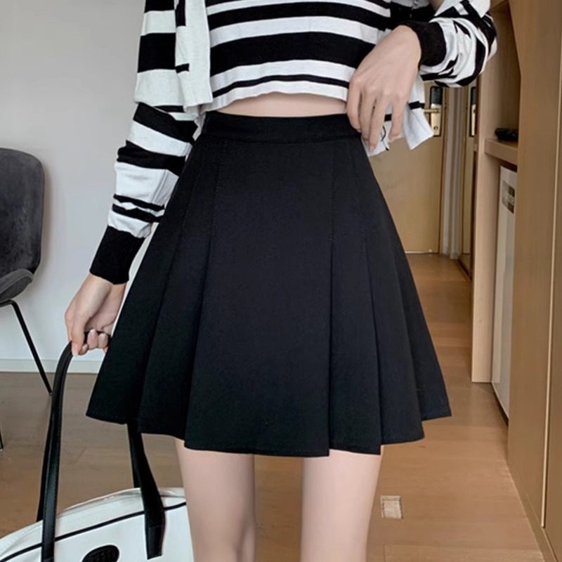 Jk rok lipit pinggang tinggi wanita, rok lipit warna polos, Rok wanita pinggang tinggi, rok ritsleting ukuran plus, rok a-line siswa Jepang, Rok anti paparan bm