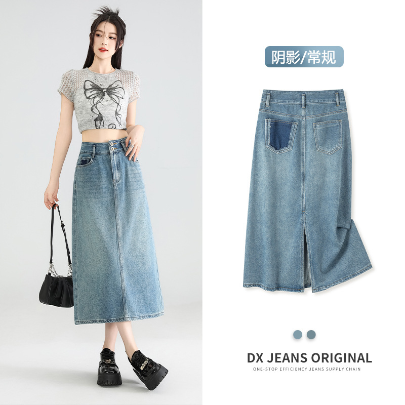 Rok Denim, rok Denim personalisasi wanita, tas terpisah, musim panas, tipis, longgar, distressed, pinggang tinggi, Rok midi belah belakang