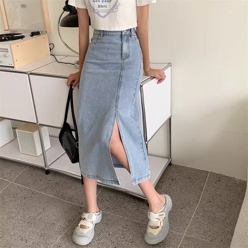 Rok Setengah Badan Model Setengah Panjang Terlihat Langsing Pinggang Tinggi Model Baru Lintas Batas Rok Panjang Denim Wanita Rok Satu Langkah Membungkus Pinggul Bercabang Ukuran Besar