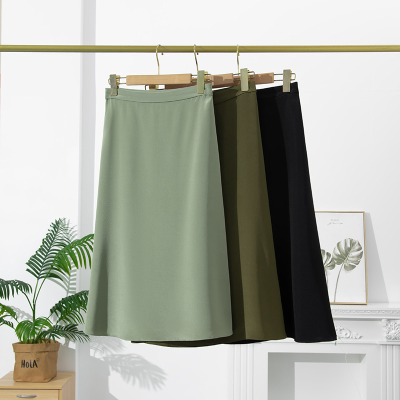 Rok sutra hitam wanita, rok a-line sutra murbei musim panas ukuran besar pelangsing kecil pinggang tinggi elegan