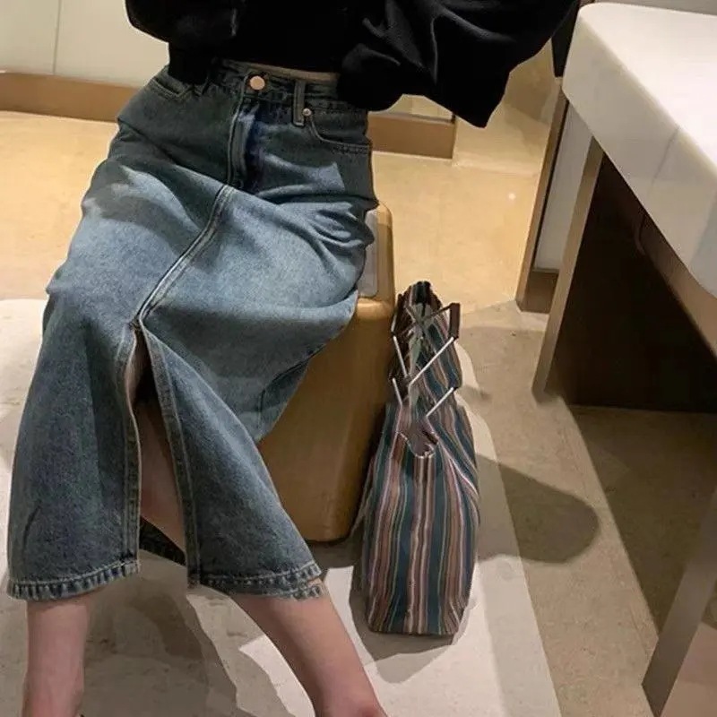 Rok denim belahan retro wanita, Rok malas pinggang tinggi kecil ukuran besar 2024