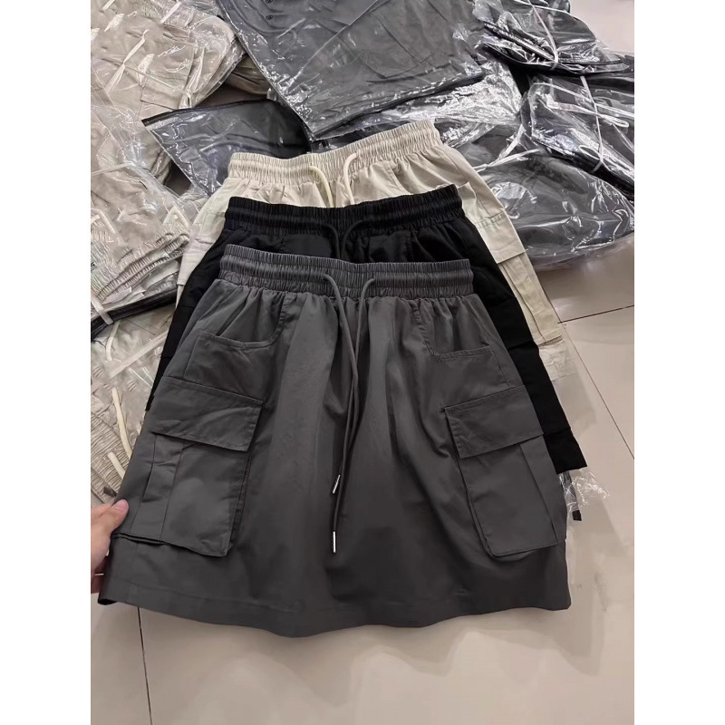 Rok Lipit Saku Musim Panas Pria Kecil Elastis Pinggang Tinggi Rok Pendek Wanita Gemuk Ukuran Besar Terlihat Kurus Rok Setengah Badan Warna Hitam