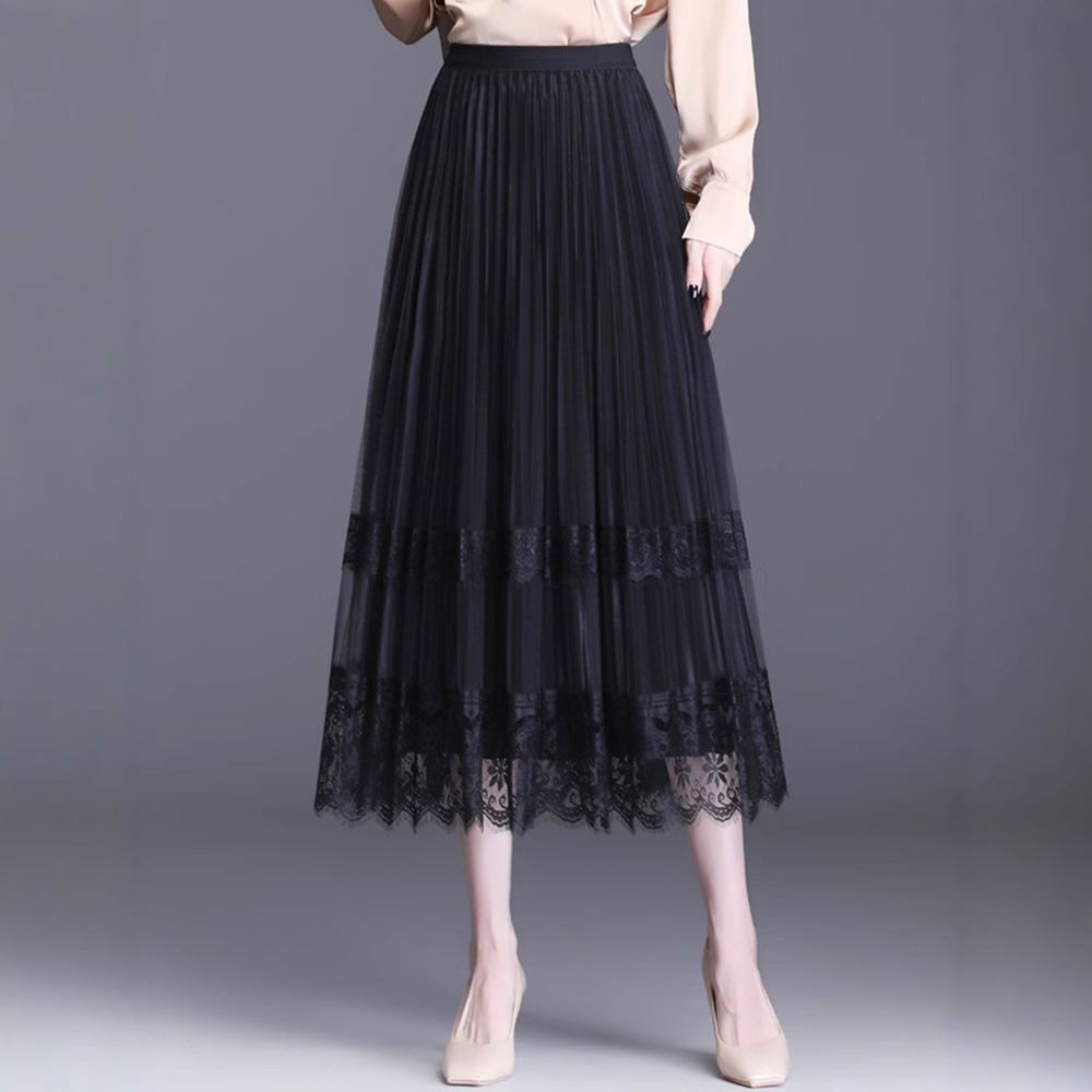 Gaun renda menggantung jala dua sisi, gaun satin Musim Semi 2024, rok lipit setengah panjang musim gugur dan musim dingin