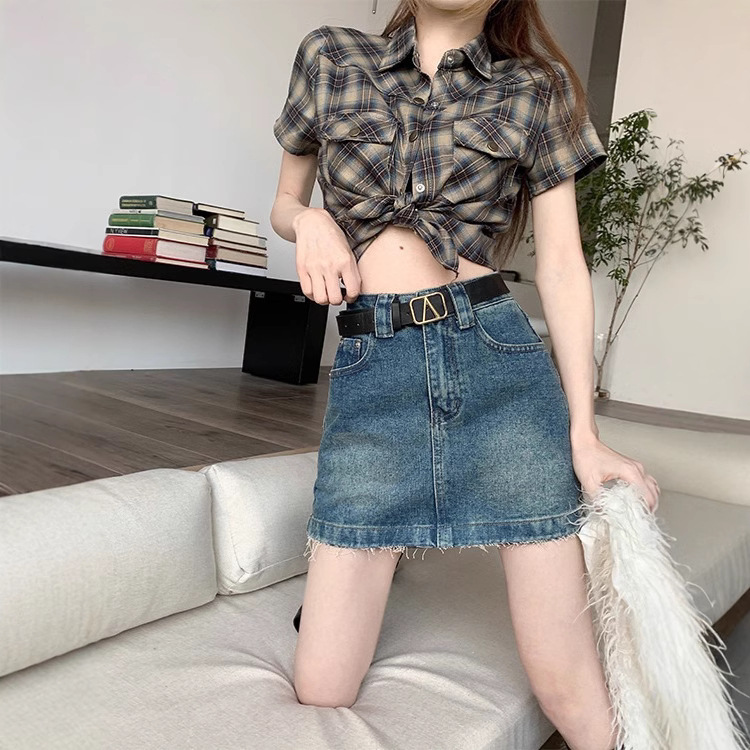 Rok A-line Retro Gaya Korea Rok Pendek Pinggir Wol Terlihat Langsing Musim Semi dan Musim Panas Rok Setengah Badan Menutupi Pinggul Denim Wanita Gemuk Ukuran Besar