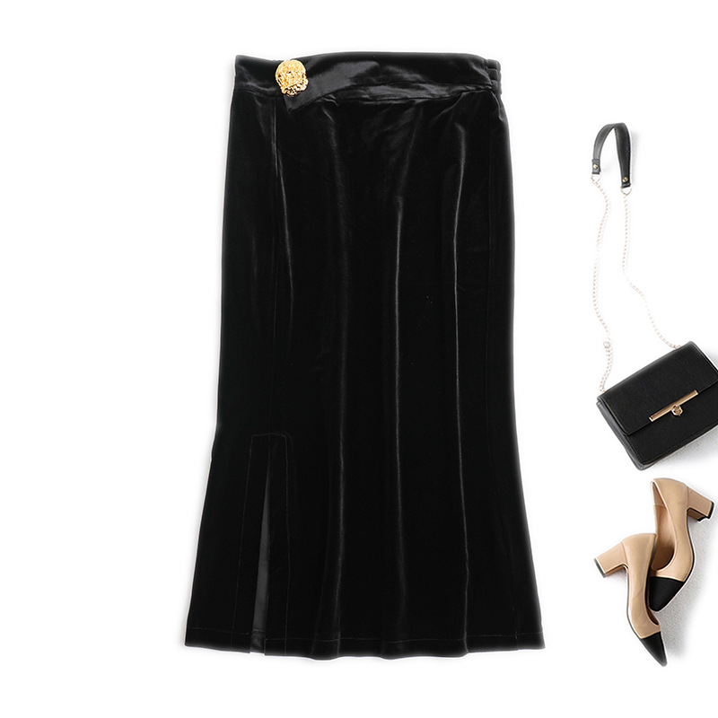 Grosir rok wanita warna solid, rok ukuran besar, panjang sedang, cantik, warna solid, temperamen Inggris, beludru emas, mawar, pinggang musim gugur