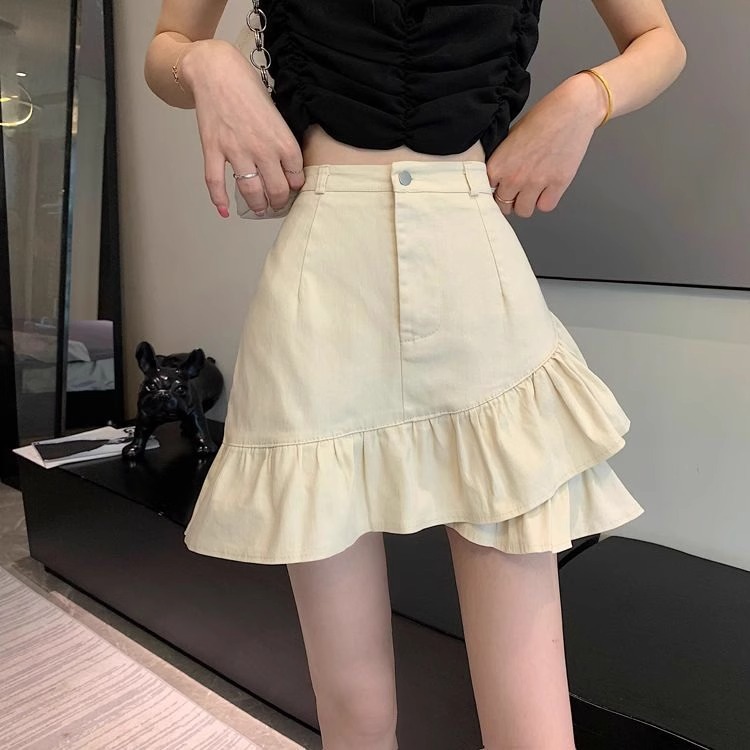 Rok Ekor Ikan Pinggiran Daun Teratai Tidak Beraturan Ukuran Besar Model Baru 2025 Rok Denim Setengah Badan Wanita Rok Pendek Menutupi Pinggul Terlihat Langsing Pinggang Tinggi