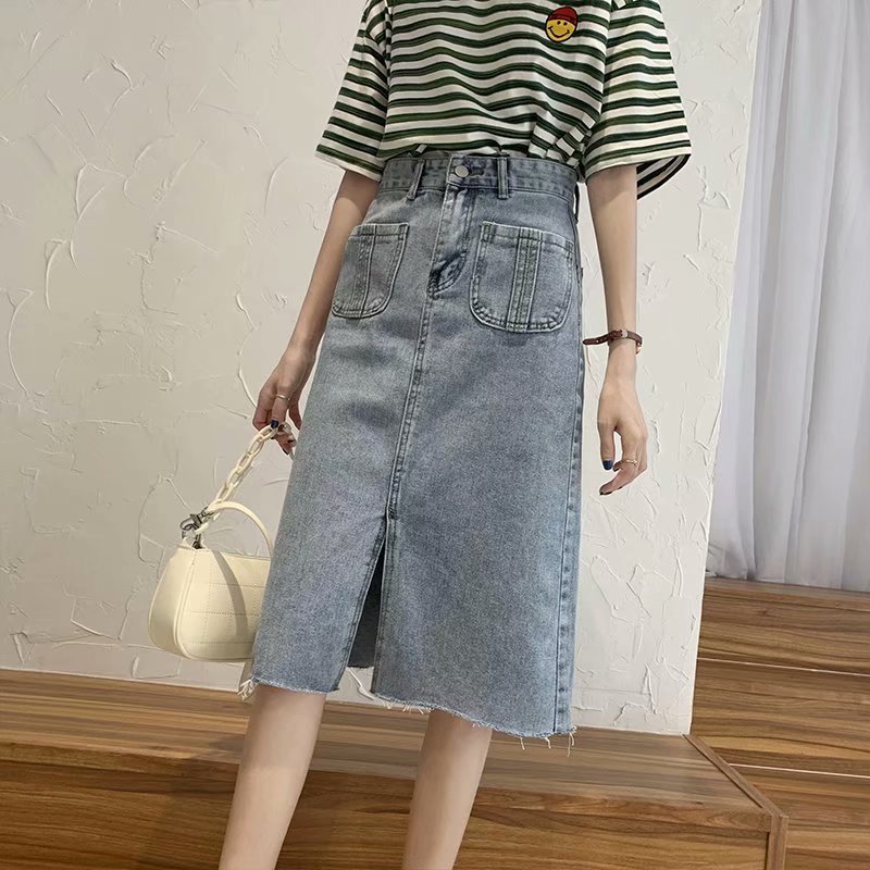 Rok Denim wanita, rok Denim terbelah, ramping, gadis gemuk, ukuran plus, rok Denim panjang setengah, gaya Hong Kong, retro, baru, Musim Panas 2024