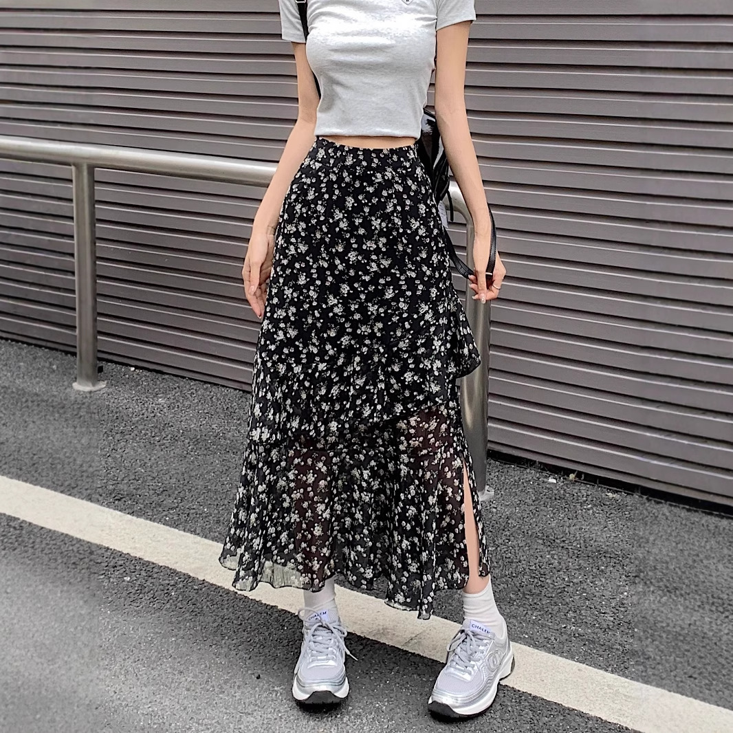Rok Setengah Badan Sifon Berbunga Tidak Teratur Rok Panjang Sedang Menutupi Pinggang Tinggi Rok Setengah Panjang Ukuran Besar Musim Panas Pakaian Wanita