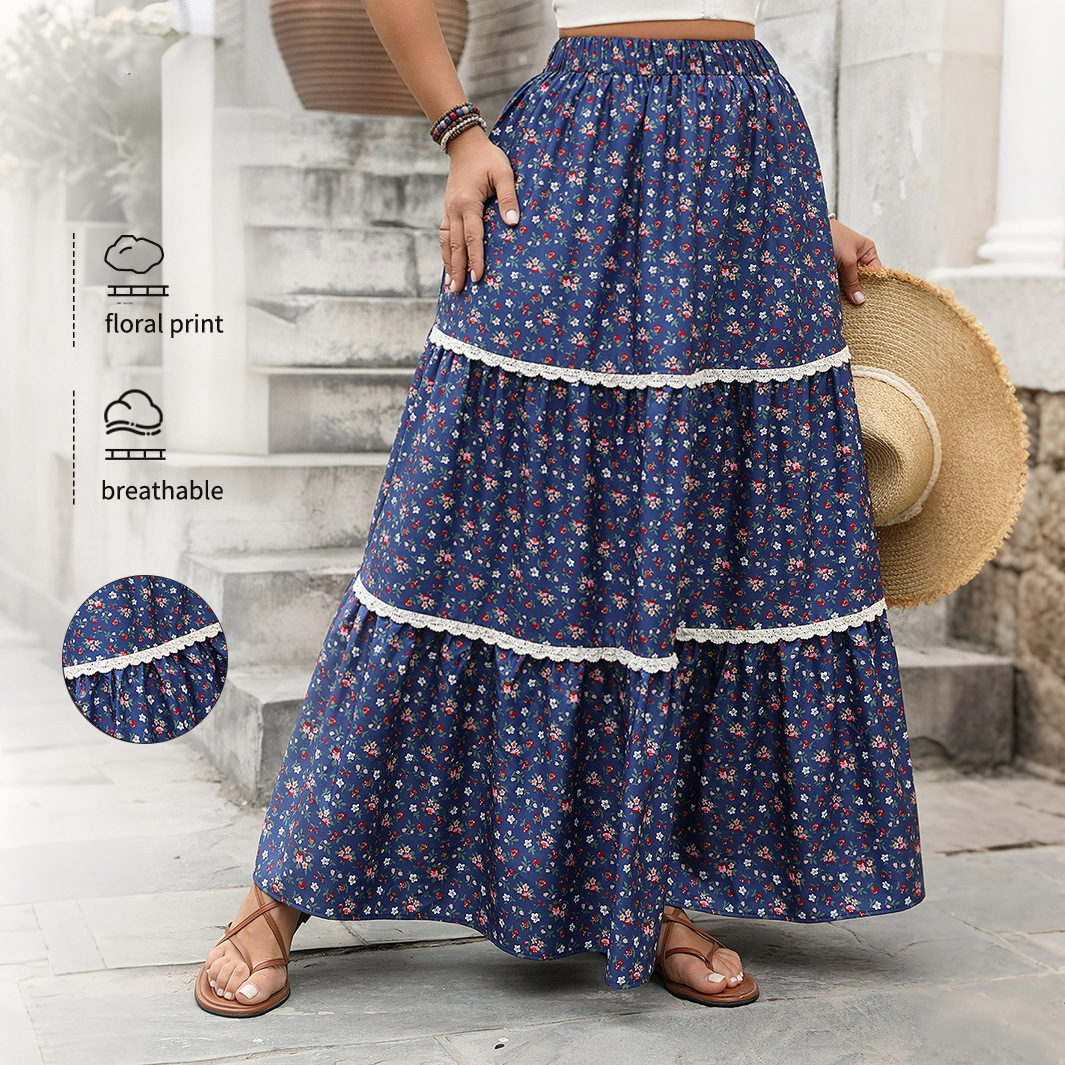 Rok wanita ukuran besar musim semi dan panas 2025 bergaya kasual elegan dengan motif cetak dan patchwork, model lebar dan serbaguna, gaya Eropa dan Amerika.
