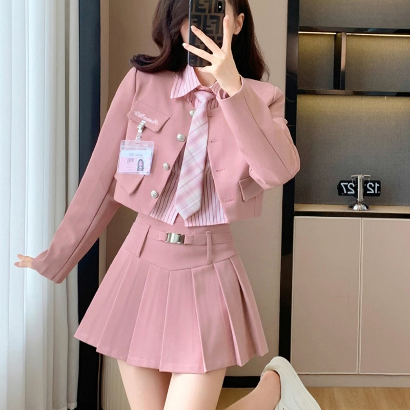 Produk Baru Musim Semi Musim Gugur 2025 Modis JK Pakaian Jas Model Pendek Gaya Kampus Rok Lipit Satu/Tiga Set