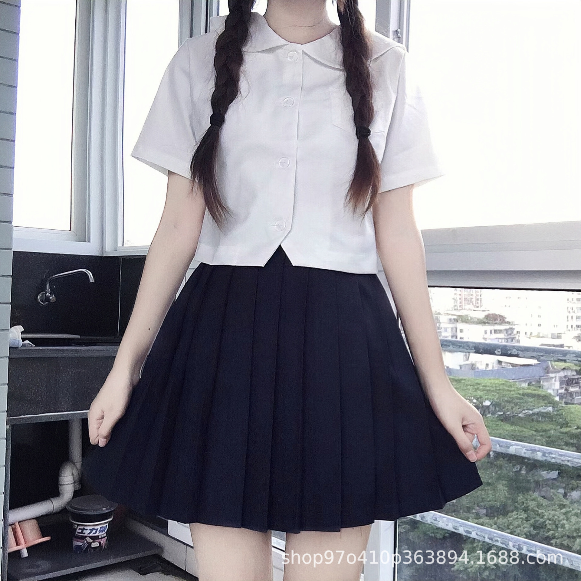 Setelan Seragam JK Sederhana dan Elegan Kemeja Membentuk Pinggang Model Pendek Gaya Sekolahan Manis Rok Setengah Lipit Gaya Amerika Lengan Pendek Set Dua Potong