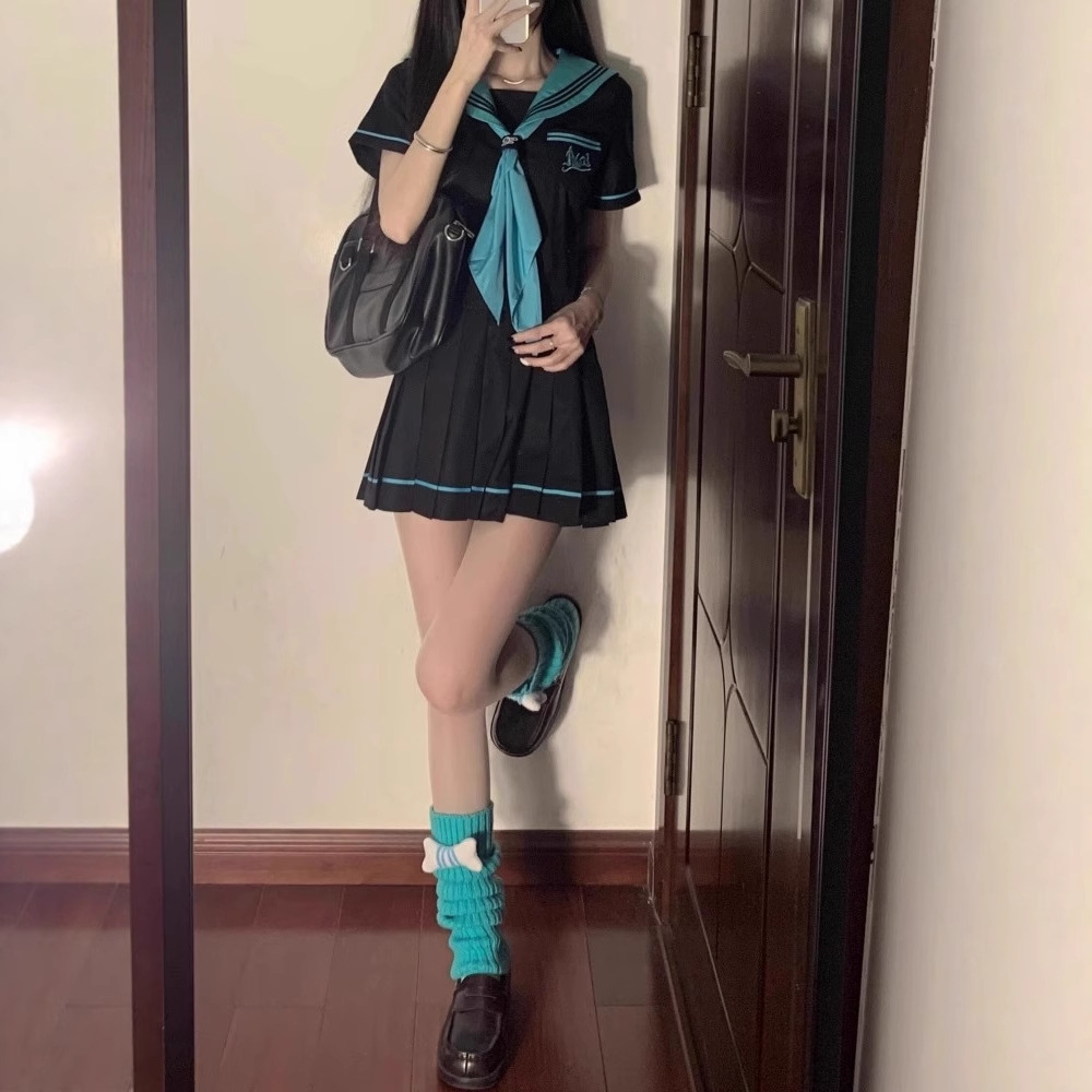 Setelan Seragam JK Gaya Sekolah Musim Panas Gaya Sekolah Jepang Pakaian Laut Wanita Baju Atasan Rok Lipit Dua Set Gaun