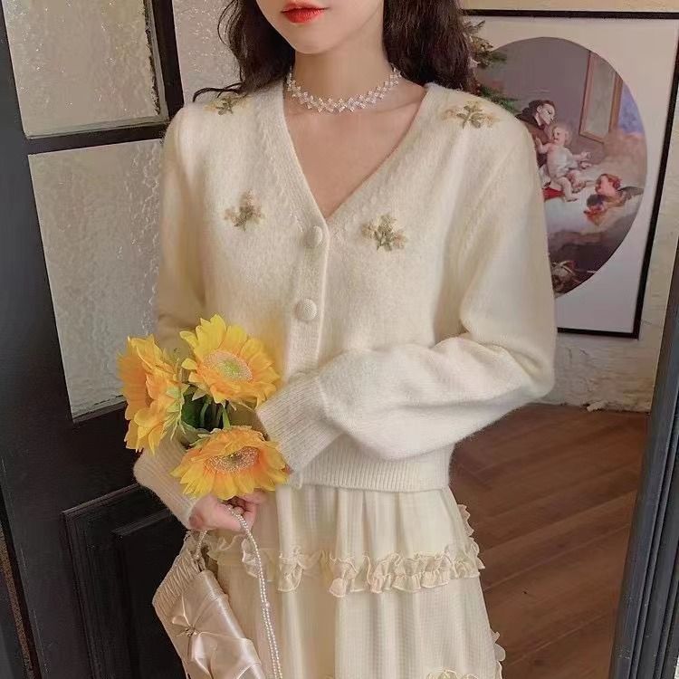 Kardigan V-neck bordir wanita, atasan longgar lengan panjang siswa warna solid sweater rajut baru musim gugur dan musim dingin 2023