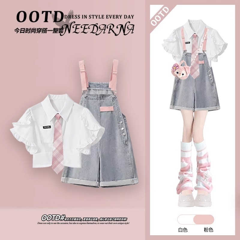 Setelan Seragam JK Gaya Mahasiswa Amerika Murni Kemeja Gadis Pedas Seksi Musim Panas Wanita Atasan Model Pendek Rok Pendek Lipit