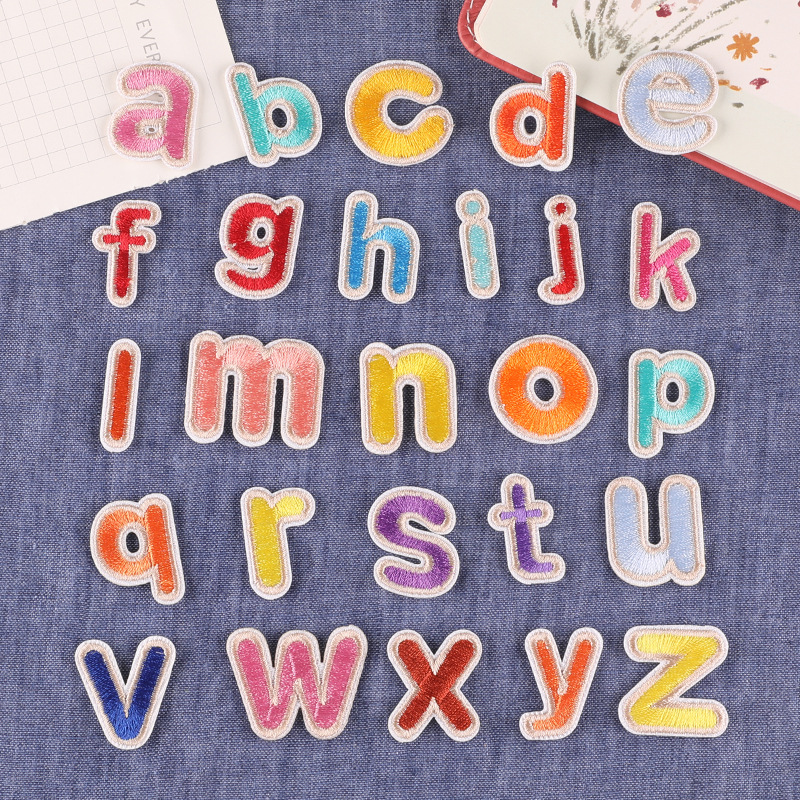 Stiker bordir stiker kain 26 warna-warni Inggris kecil huruf perekat stiker tempel seragam sekolah nomor lencana pinyin label bordir