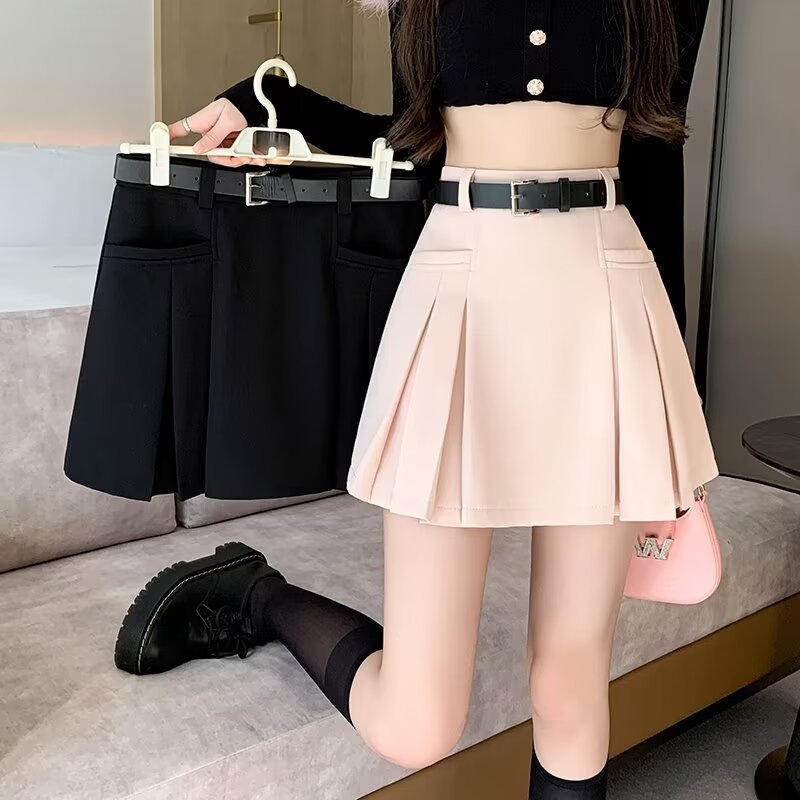 Rok Lipit Warna Aprikot Rok Pendek Huruf A Pria Kecil Terlihat Langsing Pinggang Tinggi Model Baru 2025 Tipis Musim Panas Wanita Rok Setengah Badan Lipit Halus JK
