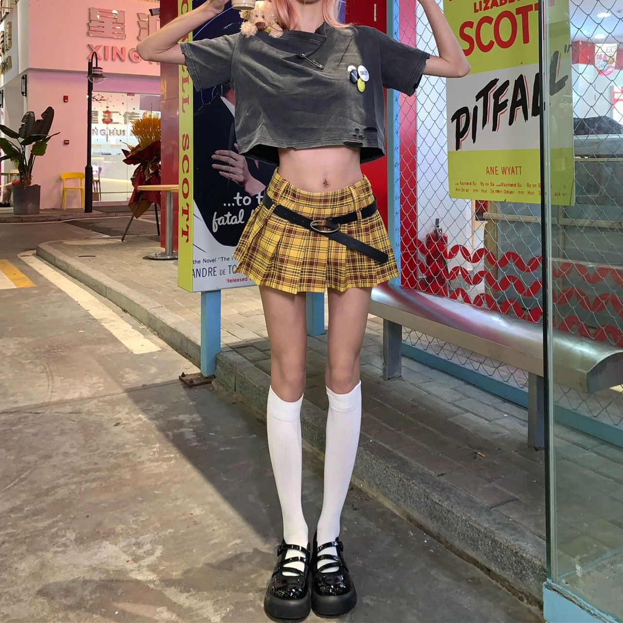 Rok Lipit Kotak-Kotak Warna Kuning Gaya Amerika Retro Rok Setengah Badan JK Gadis Pedas Gaya Desain Ukuran Besar Wanita Rok Pendek Huruf A Gaya Kampus
