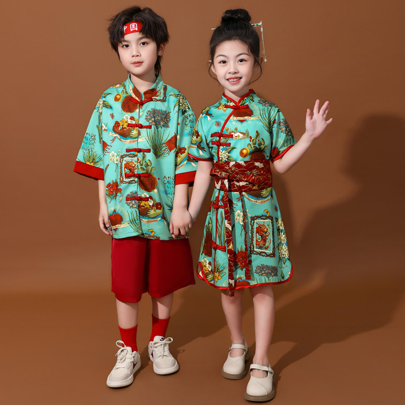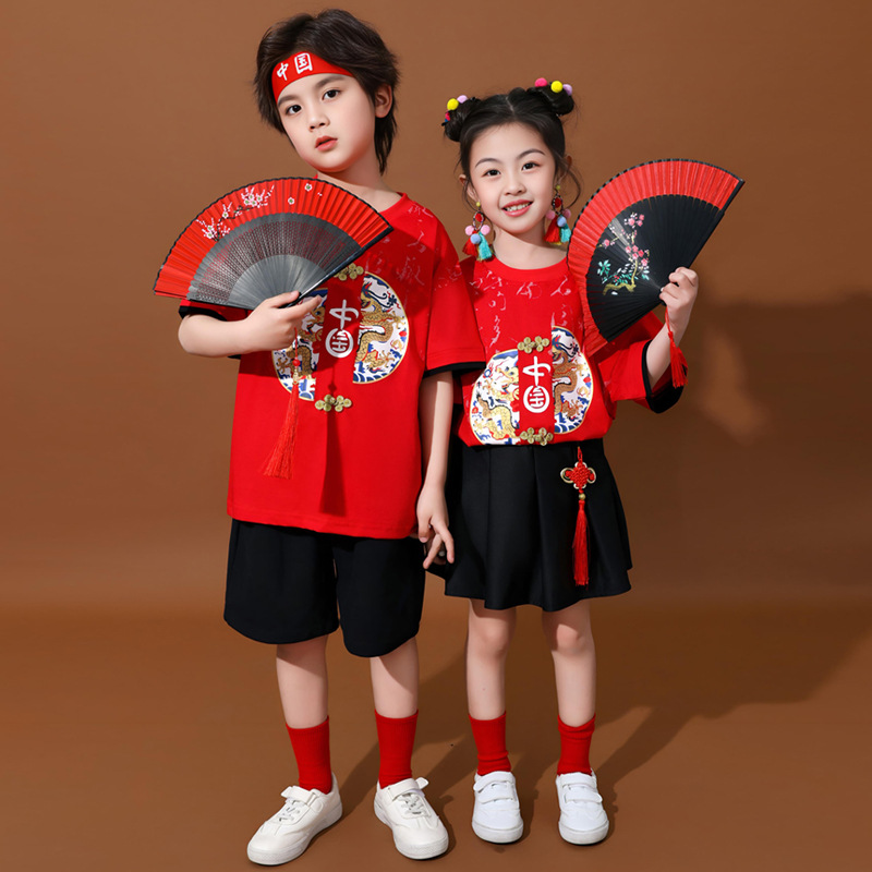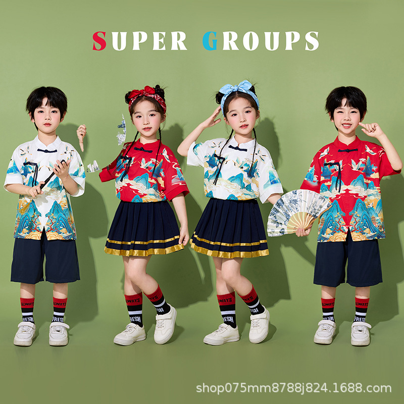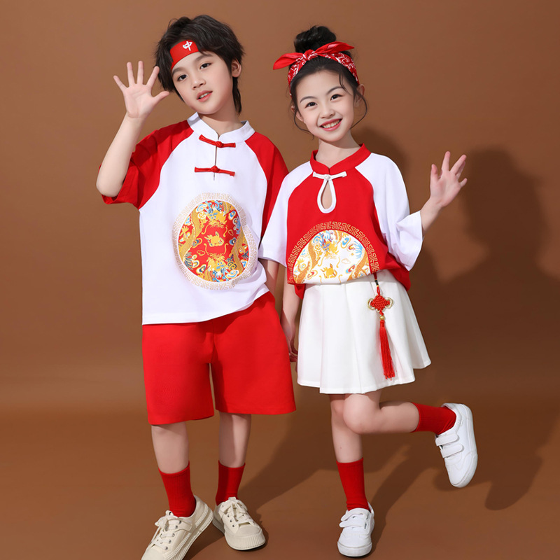 Pakaian penampilan pemandu sorak anak-anak pakaian olahraga siswa sekolah dasar gaya Tiongkok pakaian pertunjukan taman kanak-kanak setelan lengan pendek musim panas