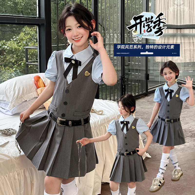 女童夏装假两件连衣裙2025新款儿童女孩学院风jk裙礼服主持表演服