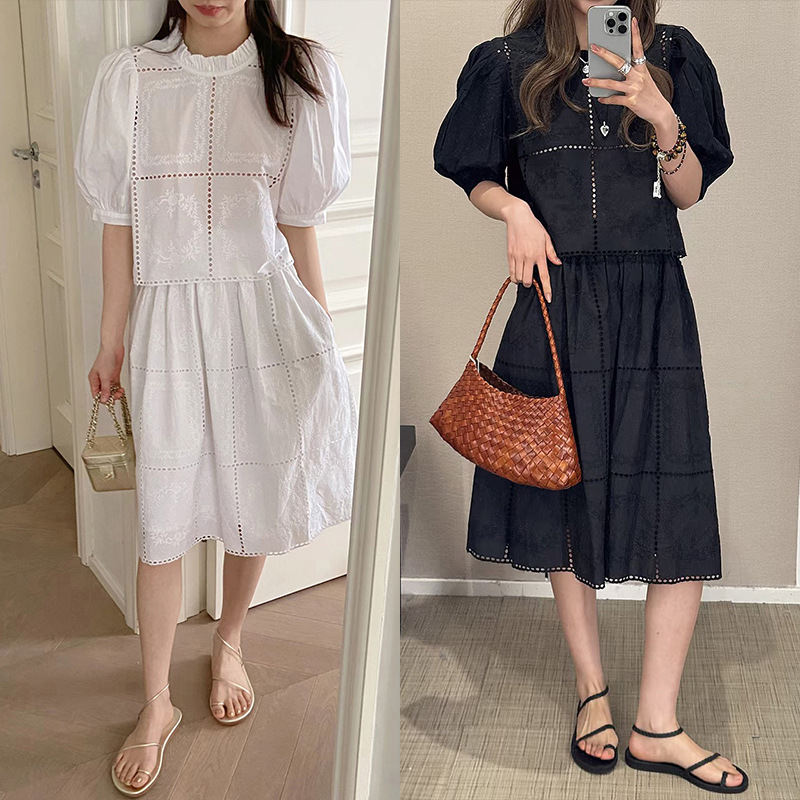 Set Rok Setengah Panjang Atasan Kerah Jamur Bordir Lengan Busa Renda Model Pengurangan Usia Musim Panas 2025 Niche Gaya Perancis 25277