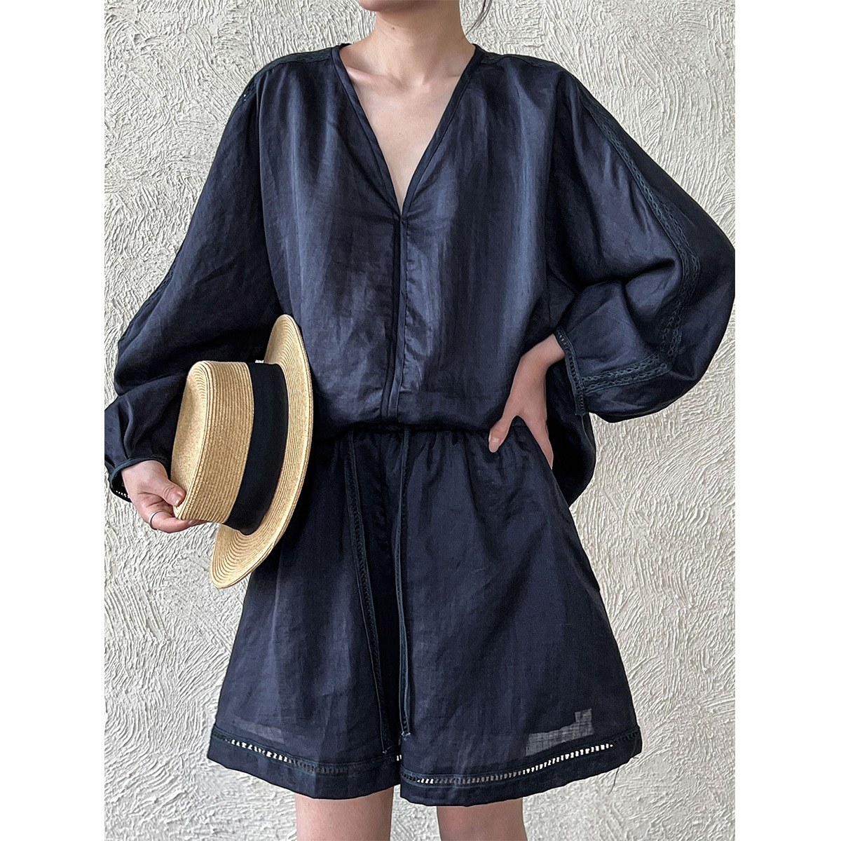 Gaya Prancis Niche 2025 Musim Panas Manis dan Pedas Lengan Busa Atasan Kerah V Pinggir Cangkang Celana Pendek Wanita 25372