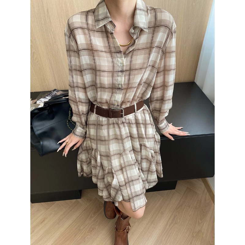 司南 含腰带 中古腔调 小众设计感格纹显瘦衬衫式连衣裙 SN7801