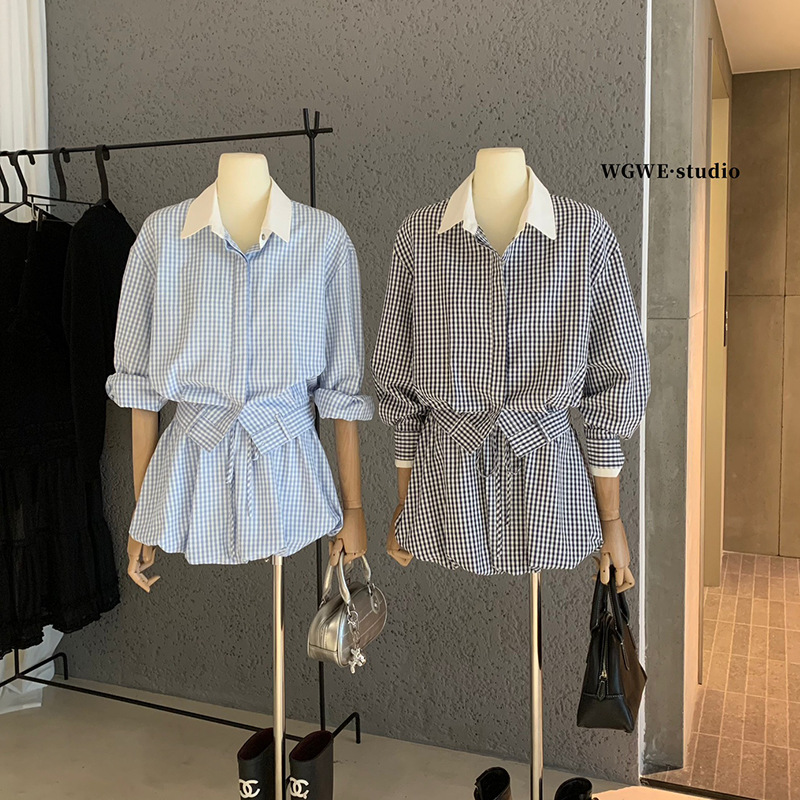 WGWE7449学院风撞色时髦套装翻领格子外套百褶抽绳半身裙两件套