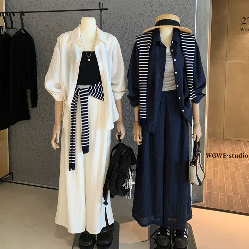 WGWE6857拼接条纹披肩衬衣宽松休闲百搭上衣衬衫休闲裤套装