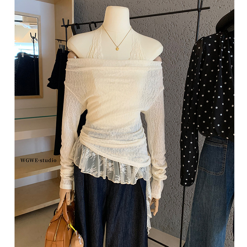 WGWE7667挂脖蕾丝拼接吊带+显瘦长袖T恤上衣套装