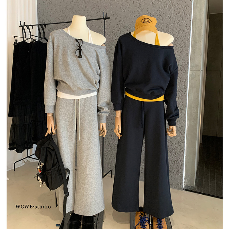 WGWE7671云朵慕斯慵懒感斜肩挂脖背心卫衣休闲裤三件套