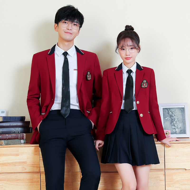 Setelan seragam jk gaya Korea wanita, tiga potong baju ketat pinggang gaya Amerika warna merah hitam, ikat pinggang