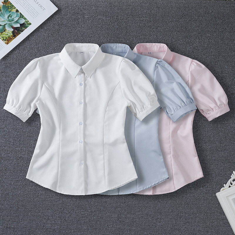 Kemeja wanita pita warna polos, kemeja seragam jk musim panas, kancing puff, semua cocok, lengan pendek ketat pinggang kuliah musim panas