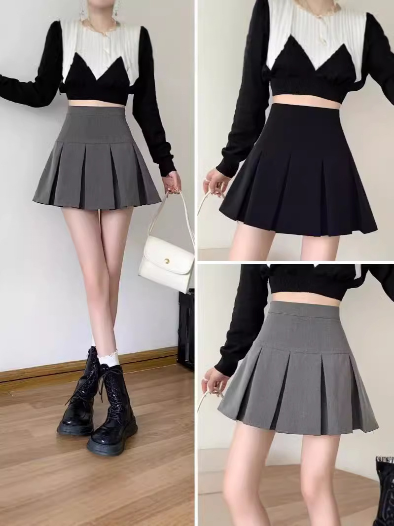 Rok Setengah Badan Huruf A Pria Kecil Rok Pendek Lipit Warna Hitam Mudah Dipadu Padan Perguruan Tinggi JK Seksi Terlihat Langsing Pinggang Tinggi Wanita