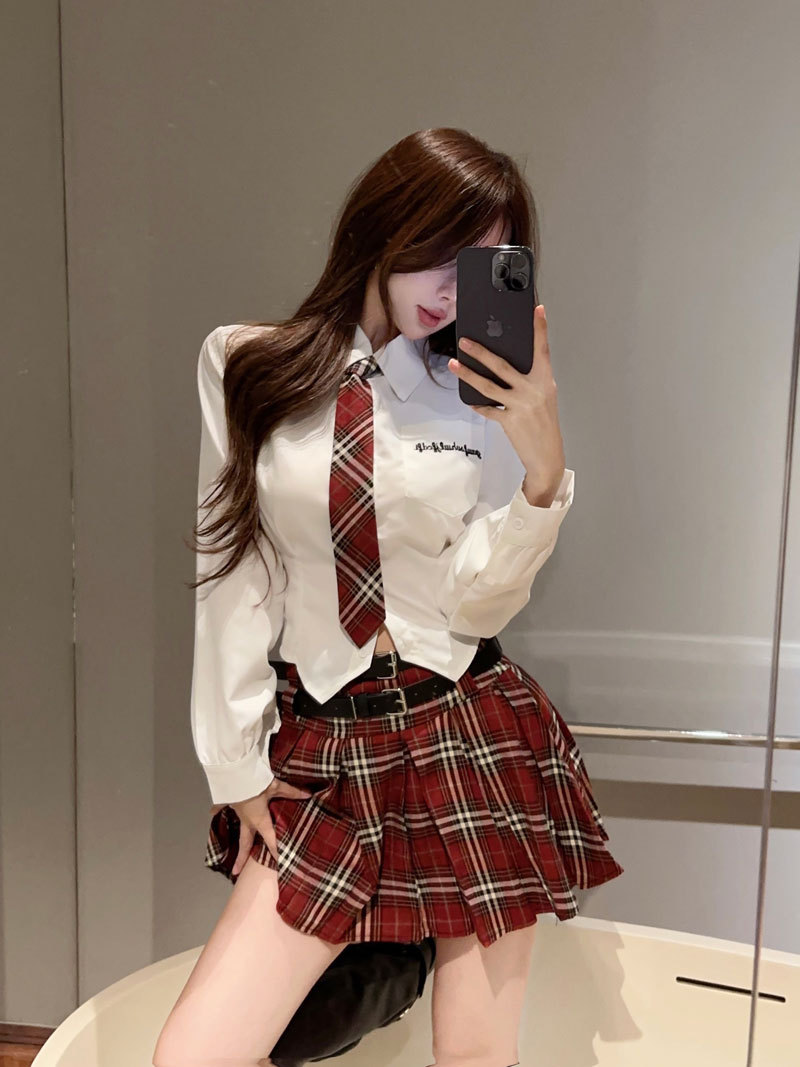 Setelan Gaya Mahasiswa Amerika Kemeja Model Pendek Selebriti Internet Gaya Desain Manis dan Pedas Seragam JK Rok Setengah Badan Pinggang Tinggi Setelan Dua Potong