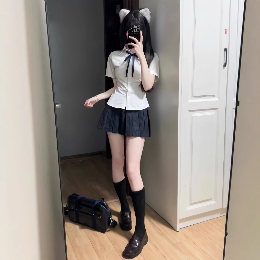 Setelan JK Seragam Wanita Model Baru 2025 Kemeja Model Pendek Murni Gaya Kampus Musim Panas Rok Pendek Setengah Panjang Pinggang Tinggi Setelan Dua Potong