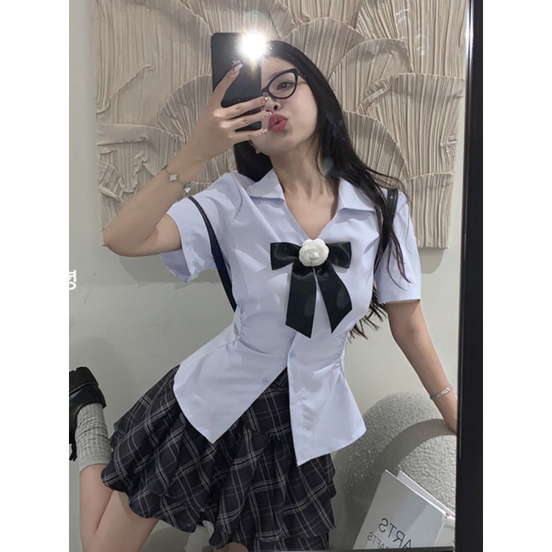 Qibai kemeja lengan pendek anak perempuan, baju seragam sekolah Thai gaya preppy, kemeja temperamen musim panas dua potong