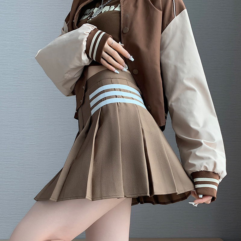 Rok lipit musim panas wanita, rok a-line pinggang tinggi baru tiga bar bergaris gaya preppy kecil jk wanita