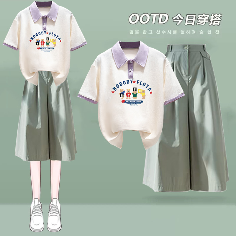 Setelan pakaian kaki lebar untuk wanita, pakaian atasan pendek polo gaya Korea pinggang tinggi ramping Musim Panas 2024 untuk pelajar wanita