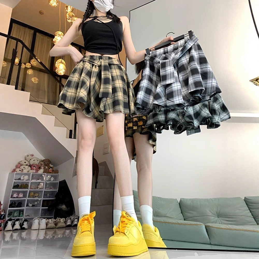 Atasan Kotak-Kotak-Kotaknya Tirai Kentut Model Satu Potong Rok Musim Panas Menutupi Pinggul Hiasan Hip-hop Anak-anak Kemeja Bertumpuk untuk Tarian Siswa