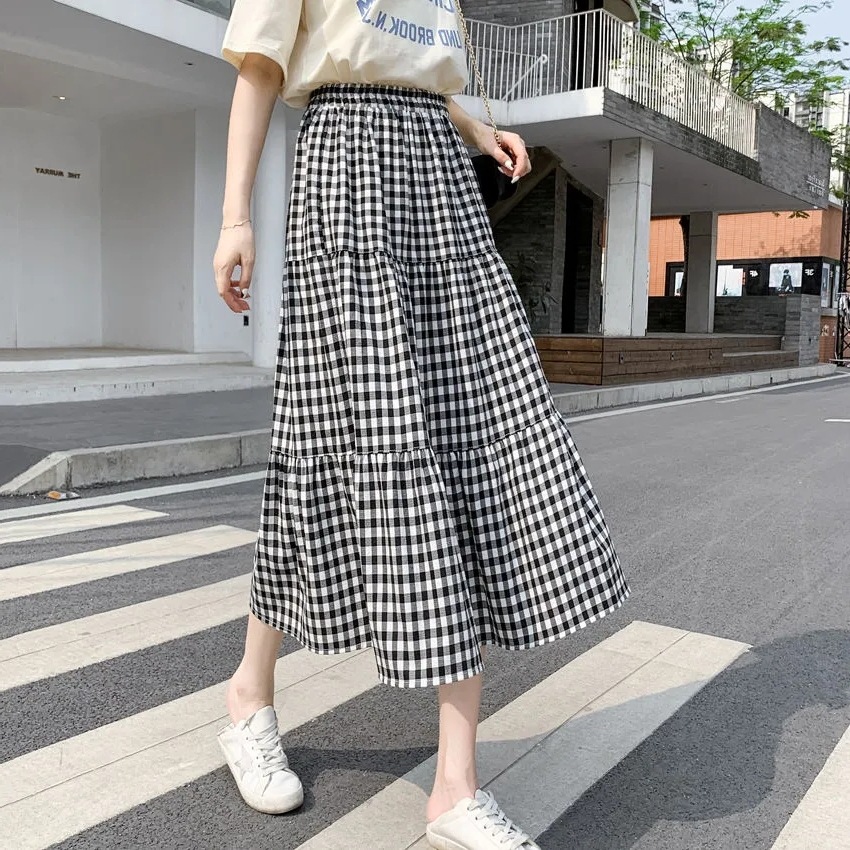 Rok Pendek Pinggang Tinggi Dengan Katun Rok Setengah Badan Siswa Wanita Rok A-Line Kombinasi Kotak-Kotak Slim Fit Seni Model Panjang Sedang Terlihat Langsing Longgar