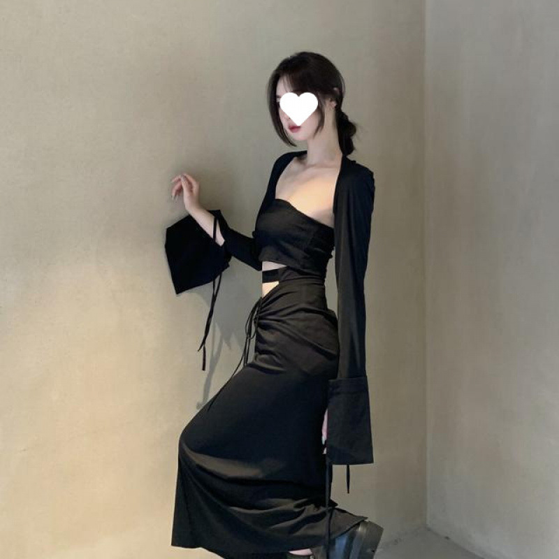 Rok Setengah Badan Tali Serut Warna Hitam Pakaian Wanita Setelan Tunggal Rok Panjang Sedang Menutupi Pinggul Berongga Slim Fit Rok Siswa Musim Gugur