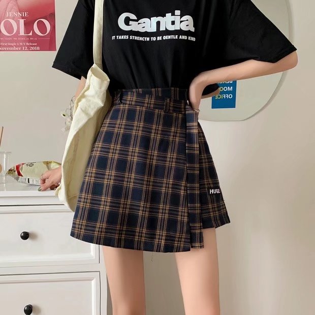 Rok kotak-kotak wanita dua potong palsu, rok kotak-kotak wanita gemuk gaya Korea serbaguna kaki lebar modis Musim Semi dan Gugur
