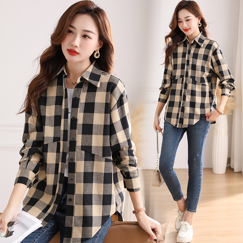 Kardigan Satu Bit Lengan Panjang Katun Murni Kemeja Kotak-Kotak Kasual Fashion Wanita Model Panjang Sedang Musim Semi Musim Gugur Siswa Longgar Gaya Korea