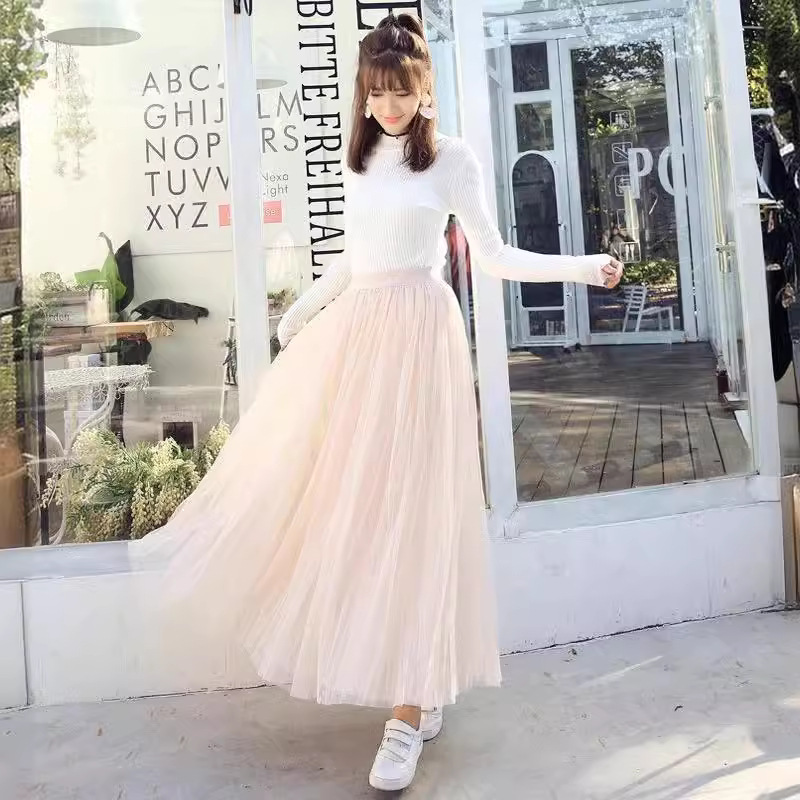 Rok jala aprikot empat musim, rok lipit panjang setengah musim panas, rok a-line warna solid, rok peri untuk siswa musim gugur baru