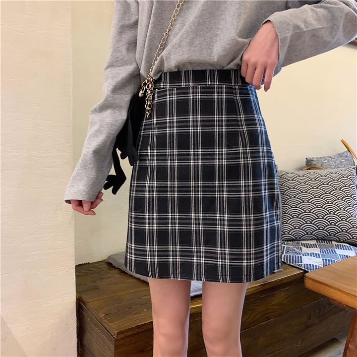 Rok kotak-kotak wanita, bawahan pinggang tinggi gaya Korea modis musim semi, musim panas, musim gugur dan dingin