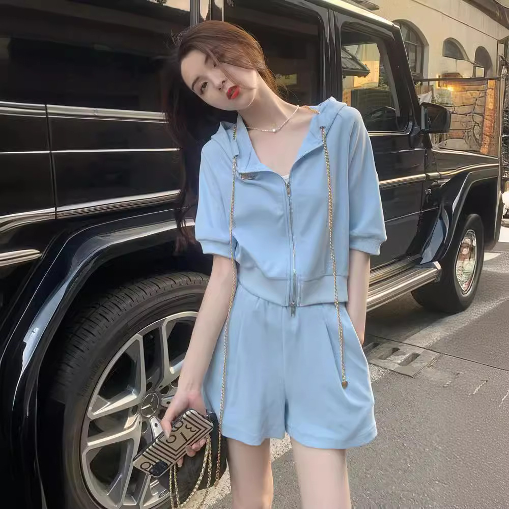 Setelan Murid Terlihat Kurus Akademi Korea Musim Panas Kardigan Berkerudung Lengan Pendek Ritsleting Ganda Celana Pendek Kaki Lebar Setelan Dua Potong Longgar